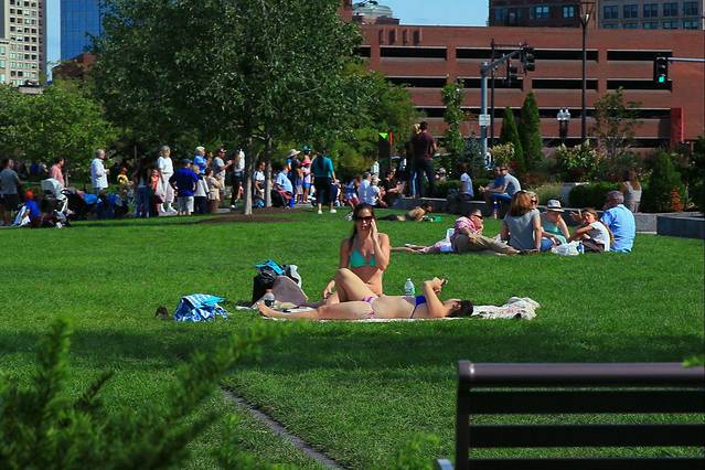 草坪上晒日光浴的美国大妞~只能说城会玩…