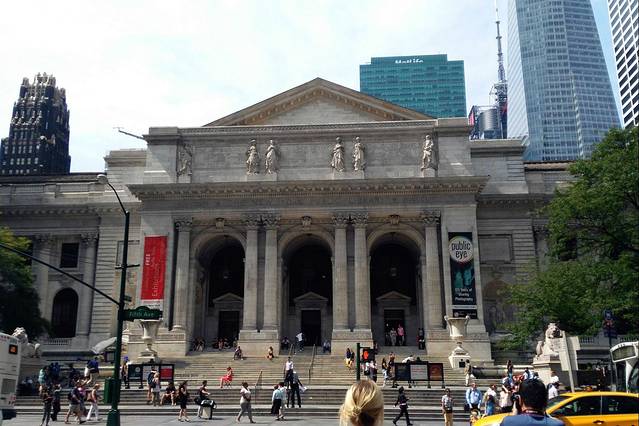 站在图书馆的台阶上。