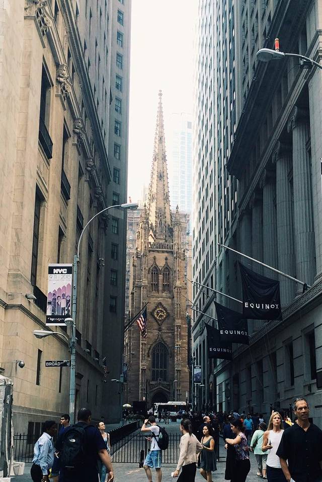 穿过华尔街看三一教堂。