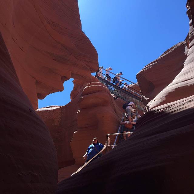 羚羊谷是来page的目的。一大早找去下羚羊谷,果然不负所望。原来羚羊谷是由雨季暴雨渗入地下孔洞积水反复冲刷形成,再加经年的风蚀。进下羚羊谷先要爬下极陡的铁梯。