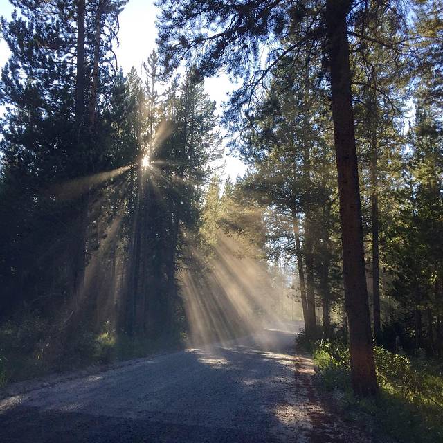 Signature Mountain, 过车,尘土飞扬,带出林间几缕阳光。记录下,在这条小路上看见下山玩耍的黑熊一只。