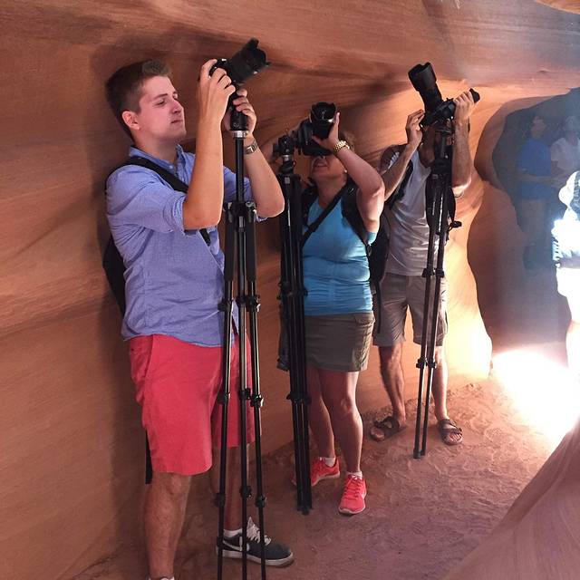 摄影团的高阶游客们,扛着三角架和设备,认真满分