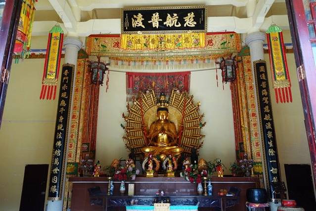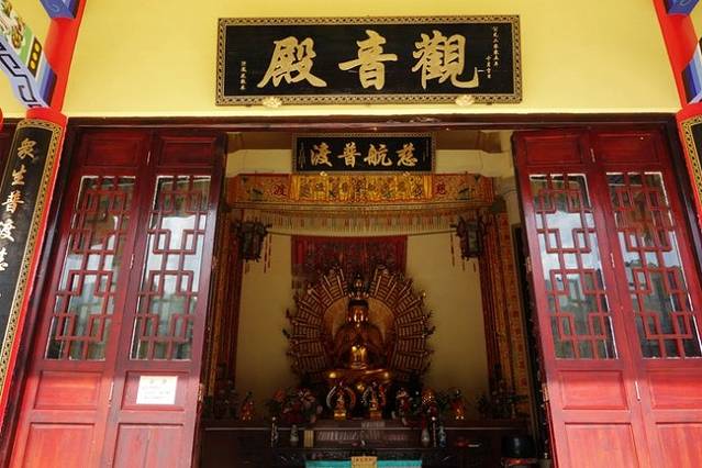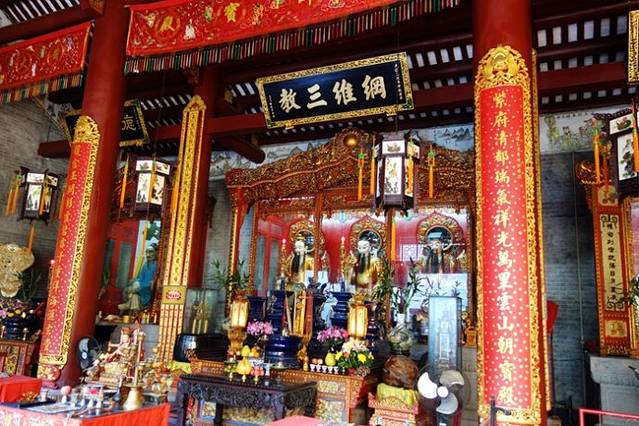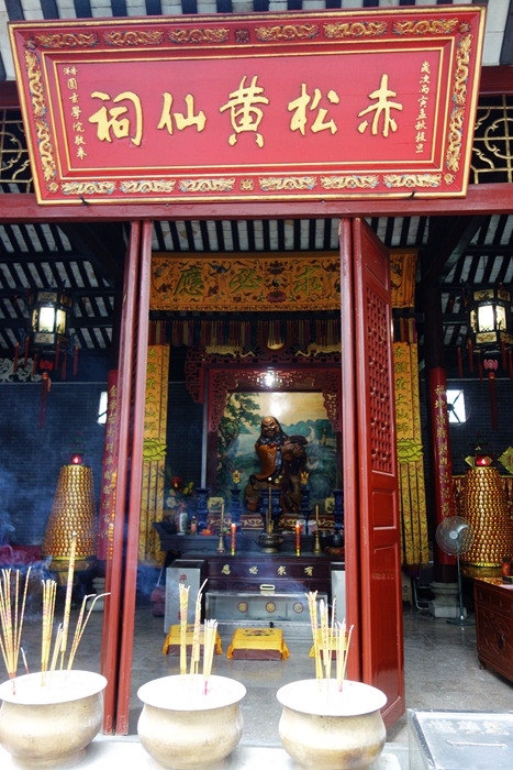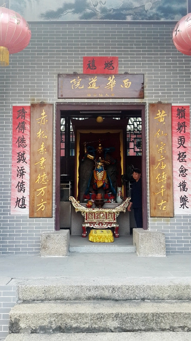 正殿内供奉着三尊高大的铜铸金身神像,居中轩辕黄帝,黄帝的左边是头戴寸帛折叠的“纯阳巾”,身背长剑,神情怡然自得的吕洞宾,右边是青巾扎髻,身披长袍,神态安祥的药仙葛洪。作为道观来说,一般供奉的是玉清元始天尊、上清灵宝天尊、太清道德天尊,即所谓“三清”。“三清”代表了道教中三位最高的神。但酥醪观却是一个例外,此中原因,一时尚未弄清。