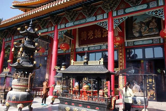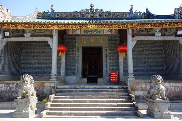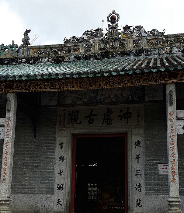 山门上的石牌匾,“冲虚古观”观名为北宋哲宗皇帝所赐,取自“元始天尊生于太元之先,禀自然之气,冲虚凝远莫知其极”。“沖虚”意为淡薄虚静,表达道家清静无为的思想。“沖虚古观”四字为清两广总督瑞麟所题。两点水的“冲”与三点水的“沖”通用,但因冲虚观是一座全木制建筑,瑞麟有意写成三点水的“沖”,取防火灾之意。正门对联“典午三清苑,朱明七洞天”,“典午”表明了建观的年代在晋朝。午属马,借指司马,是晋朝皇帝的姓氏。观门石柱有“玄景空不空,四百峰峦朝紫府;尊躬上不上,五千道德启玄门”楹联,表明了建观年代和所处仙阶。仅一小小山门,凝聚多少中华文化?!又涨姿势了!