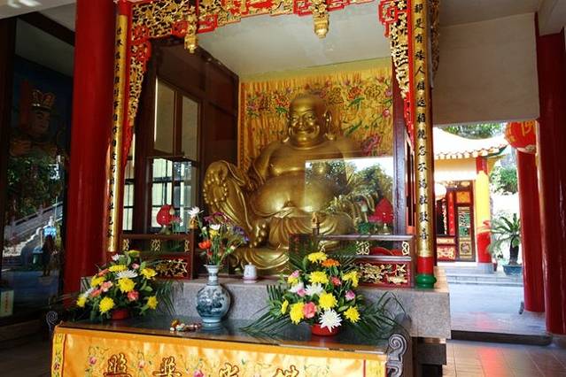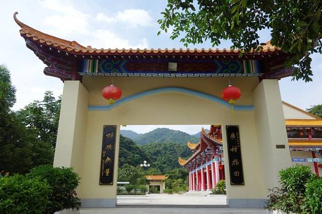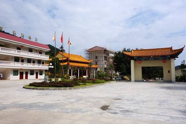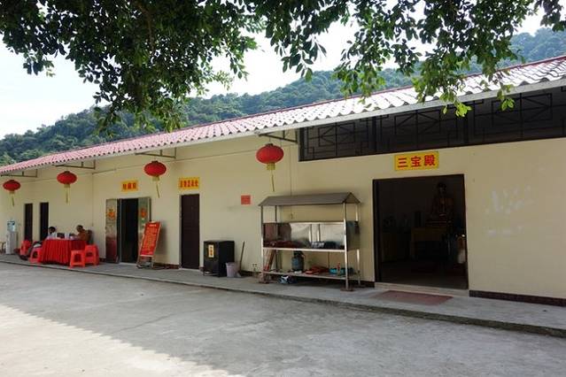 中午在冲虚观旁边的葛仙居吃客家菜午餐,赖道长的朋友、主持重建宝积寺的大德胡先生闻讯赶来作陪,同时邀请我们饭后去参观新建不久的宝积寺。罗浮山是道佛同处一山,我们是道佛同桌吃饭。饭后我们在老板的盛情邀请下,驱车前往位于博罗长宁下浪村桃子园的宝积寺,那是条进入罗浮山腹地的盘山公路,沿途有宝积寺、九天观、西华道院和酥醪观等古寺大观。宝积寺正好在盘山公路山脚的路口一侧。