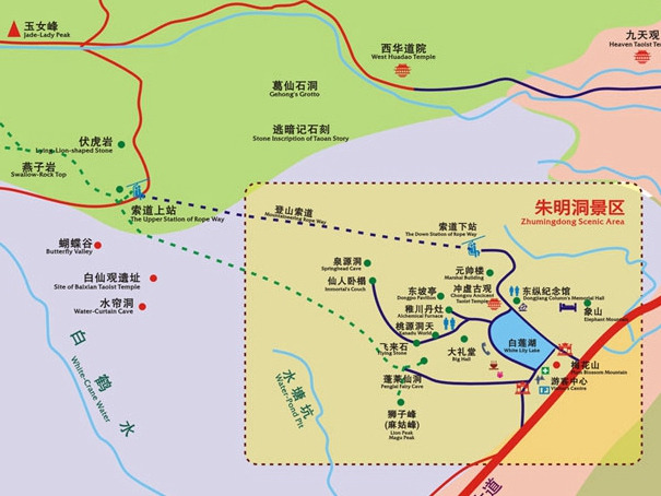 朱明洞景区是罗浮山景区的中心景区,是旅游罗浮山的必游之处。朱明洞天是罗浮山十八洞天之首,是道教第七洞天、第三十四福地。洞天是道教的称谓,朱明洞天原意为“朱明耀真之天”。朱明洞天由象山、狮山、梅花山、马山环抱。前临溪涧,背依青山,林木参天,环境幽雅,仿如世外桃源,是罗浮山风光精华所在。