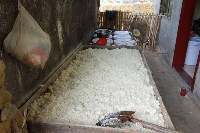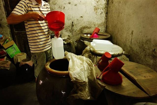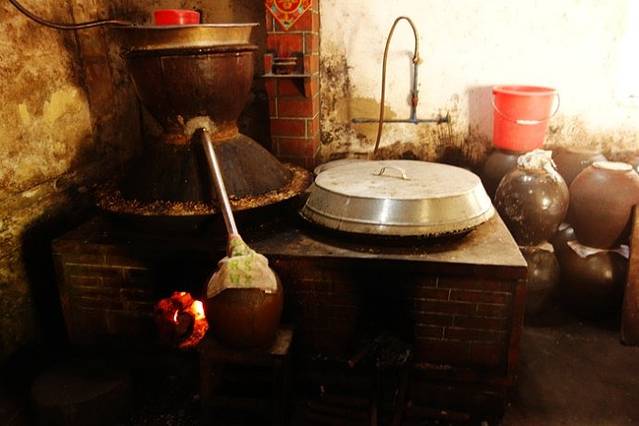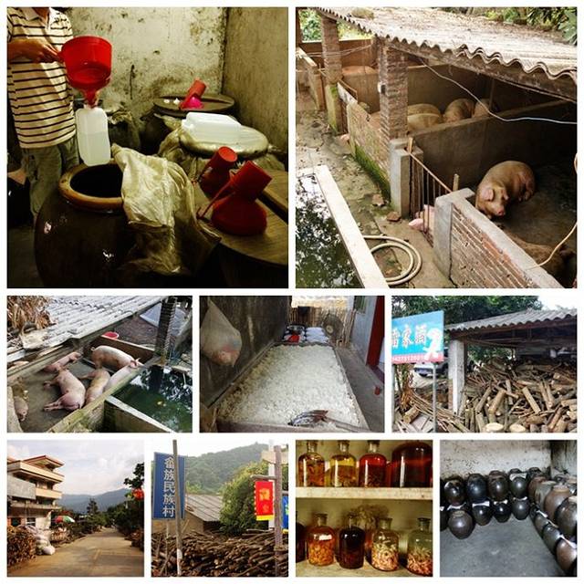 我们车沿着酥醪公路,爬山越岭,经过房屋稀少的山村乡间,经过一挂着畲族民族村旗的村庄,发现路边土房挂有“雷家酒”的卖米酒酒招儿,认真有几分像《水流传》中的朱贵酒庄,我们不禁好奇,停车走进一小农家院落,中堆满了柴火、凉晒着酒糟,对面是猪栏......有一小青年迎上来,带我们参观了院子边棚中的简陋酿酒坊--就一土灶,烧着柴火,蒸着米饭,一边就滴出烧酒,据说一斤米最多只能酿4两酒,你说有谁见过茅X酒、X粮液的酒糟?没有酒糟,必是酒精勾兑,酒精勾兑酒按国际标准是为“非酿造酒”,亦即为“假酒”。
