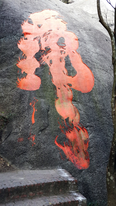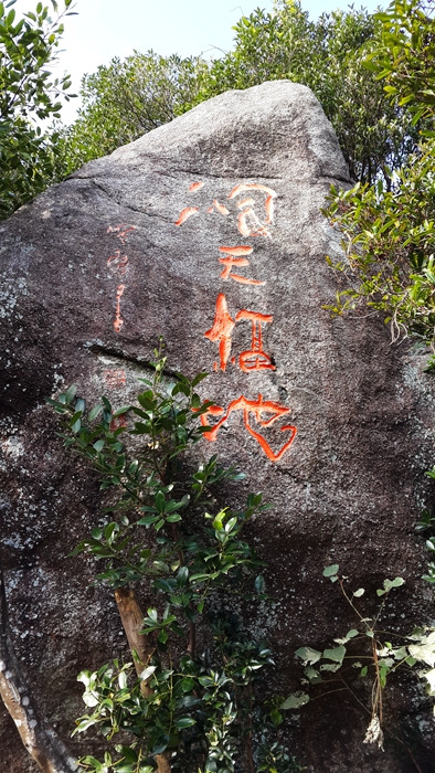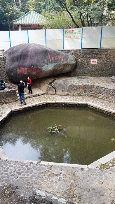 走过小桥就进入古道,古道一侧分布着华首寺的建筑群。进入华首台景区,华首台下有一圆形巨石,上刻“罗浮”二字,笔法雄浑凝重,为清代广州将军奕湘手书。华首台前有一门庭石,刻有“岭南第一山”,后有一巨石石刻“闻钟发省”。据史籍记载,这里原有一座钟楼,有贵客到即鸣钟欢迎。而最负胜名的自然景观是“飞云溅雪”瀑布和千年银炼古树。