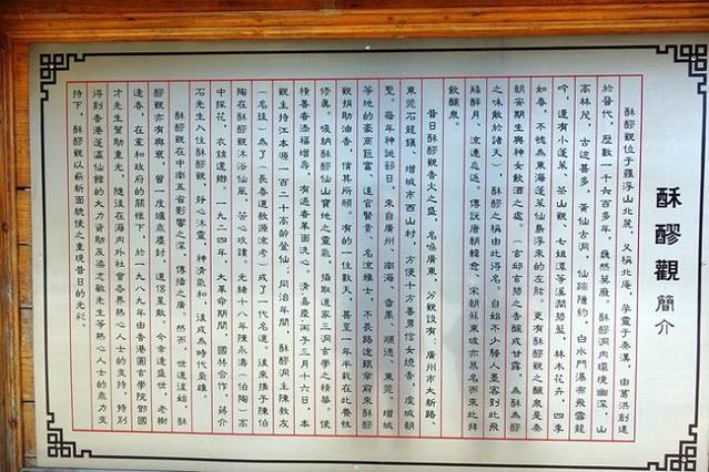 酥醪观为道教宫观,是罗浮山道教五大观之一,位于博罗县西罗浮山罗岭之北,浮山之西。前临荷塘,宏伟壮观,旧志赞曰:“洵栖灵之奥区,修养之福地。”历代视为修身圣地。酥醪观在东晋时系葛洪仙翁所创建,名“北庵”,后安期生会筋神女,酣玄碧之香酒,醉后呼吸水露皆成酥醒,因而易名酥醪观。相传吕洞宾时,来赤松云游于此,又称神仙古洞。历代均有修葺与增建,现存建筑多为清代雍正五年。观门石刻匾“酥醪观”三字为清代香山鲍俊所书。