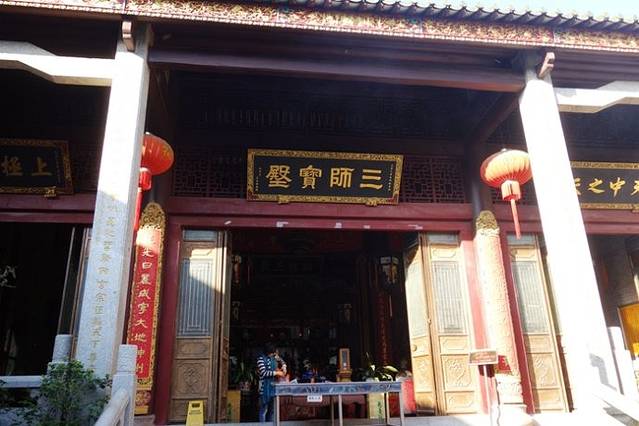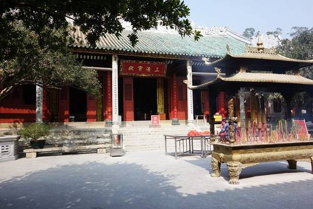 山门内为“三清宝殿”,殿前“惠民佑顺”木匾为嘉庆皇帝亲笔,殿堂内画梁彩壁,金碧辉煌。供祀道教的最高尊神元始天尊、灵宝天尊和道德天尊,及张道陵、荀玄、许旌阳、萨守坚四真君,配祀葛洪,伴以黄野人和传说中的巡山哑虎,另还配祀被仙化了的历代岭南道家朱灵芝、华子期、鲍靓、苏元朗、罗万象、单道开、轩辕集、黄励等。