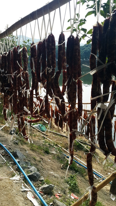 每次从罗浮山回来,都忘不了带些罗浮山山泉水、酥醪仙人菜(鲜、干)、罗浮山腊肉和罗浮山茶叶。当天我们的车在村里穿过,居然看到路边当众杀猪。有点令人惊讶的是这里居然处处有新式小楼,据说这些都是近几年卖腊肉建起来的。我想:如果是夜宿酥醪村,看炊烟袅袅,观山村夜景,聆听山虫呢喃,那将是非常美妙的一夜。下次吧,下次一定要夜宿酥醪村,感受下下这陶渊明笔下的世外桃源生活。
