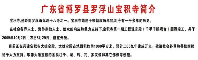 据胡先生介绍:宝积寺是罗浮山古代九观十八寺之一,始建于宋朝庆历年初,是一所一千多年历史的古寺。据《博罗县志》记载:当年古寺设有御书阁、藏太宗、真宗、仁宗御书及景德赐佛衣、嘉估藏经等。因历史变迁,宝积寺早已被毁,只留古迹。