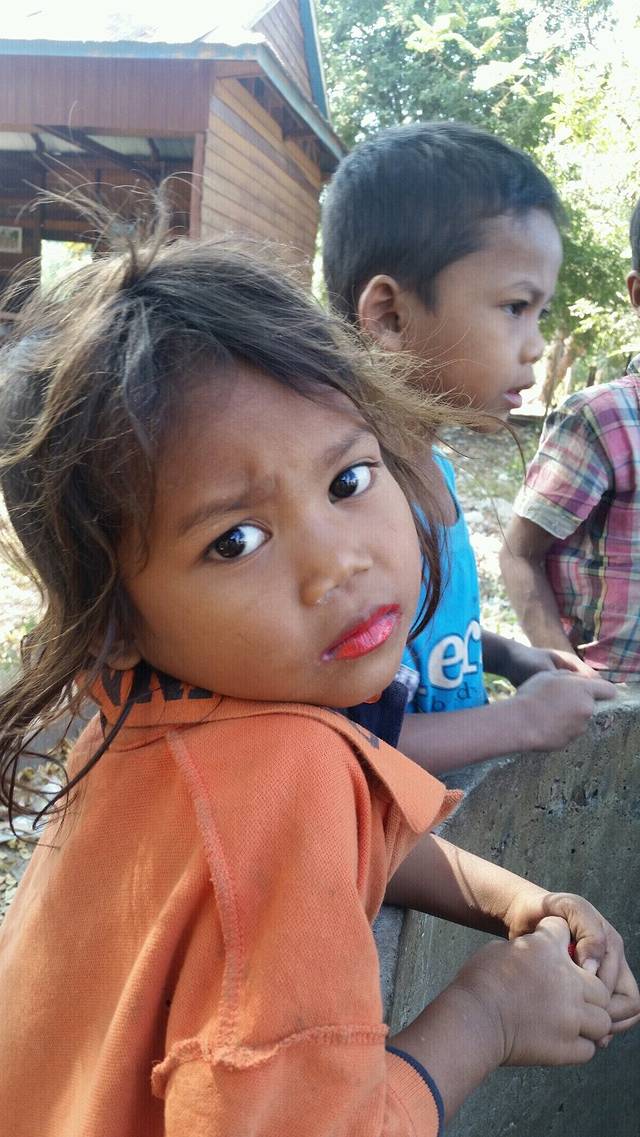 沿途见到很多小孩子友好朝你招手说hello,遇到一所小学,终于忍不住停下车来,孩子们在愉快玩耍,获得年轻老师和年长校长的许可,我开始给孩子们送糖,这里的小朋友真的很纯朴,由头到尾都是我主动在派,没有一个孩子来伸手跟你要,并且拿到糖后很礼貌双手合十羞涩道谢。好奇心驱使,我来到课室门外,应该是在课间休息吧,于是进入教室给里面的孩子们送糖果。最终只恨随身携带太少,不能给予更多,若是准备纸笔本子该多好?这些应该更加能派上用场啊。