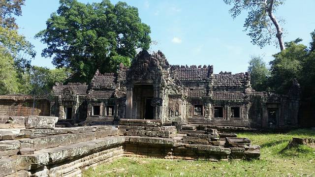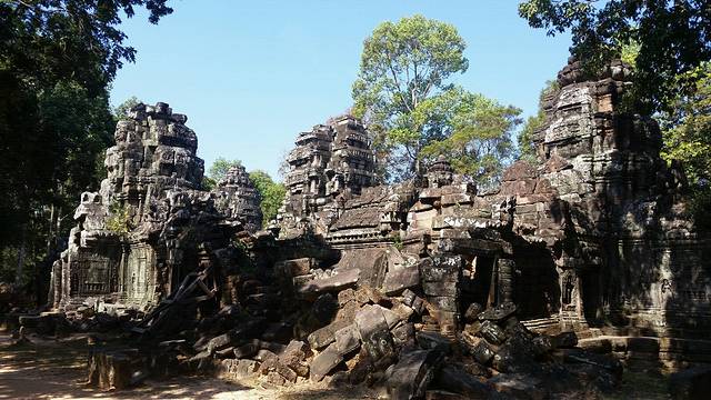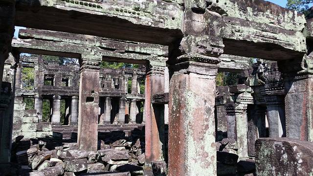 阇耶跋摩七世给它取的名称是圣剑寺,包含着“神圣之剑”的意思,这是为了纪念与暹罗军作战胜利而建,同时也是国王父亲的家庙,据说当时有10万人参与了建设呢。我爱圣剑寺墙体美丽的颜色。