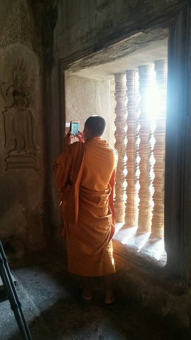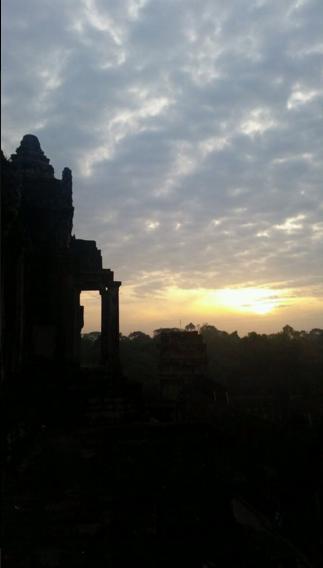 黑暗中5时开始在tuktuk上奔向日出的方向,凛冽的晨风和整齐排列飞速驰行的车队让吴哥的清晨显得格外与众不同。踏上长长的参道,天空仍然是黑色的,须借用手电筒的光芒来摸索前进,到处都是小声谈话充满期待的人们,所有的人都在等候吴哥寺的五座尖塔展出它们庄严的轮廓。