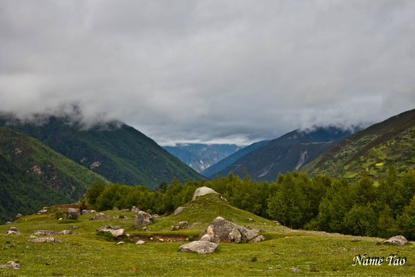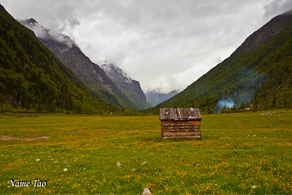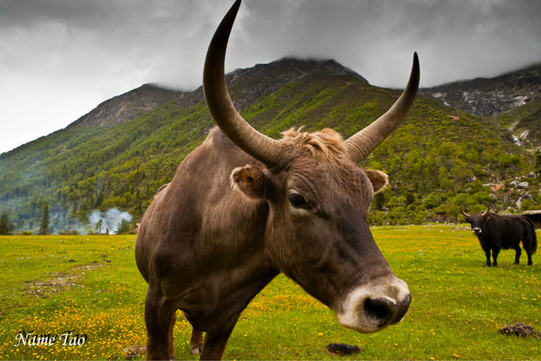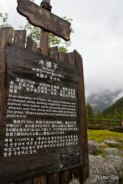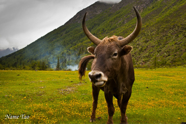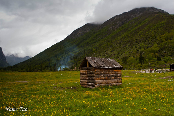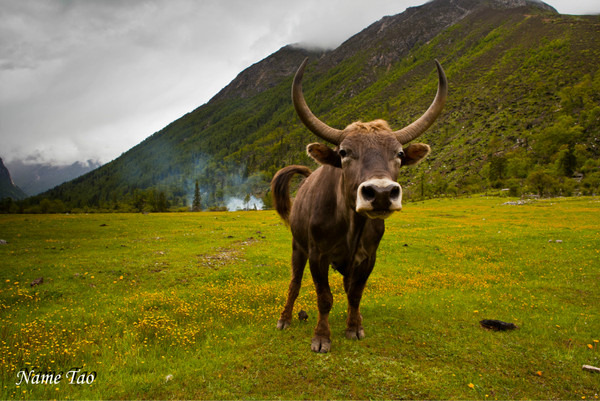 穿越遮天蔽日的原始深林,翻过一排围栏,眼前豁然开朗,牦牛信步草间,终于到达了木骡子。木骡子位于四姑娘山北面山脚,是一个海拔3760米的大草坪,宽阔而平坦,是沟内植物最为丰富的地方。这里本可以欣赏到四姑娘山的背影,哎。。。可是雾太大了,等了很久始终没有看到。如果不宿营,走到这里就不能再向前了。