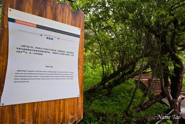 力竭干枯之际,用残存生力托起199个新生命,深根连枯杆,枯杆育幼枝,形象化的把高尚的母亲体现得淋漓尽致,三根枯杆又分别指向双桥沟,长坪沟和海子沟,成一天然导游图。