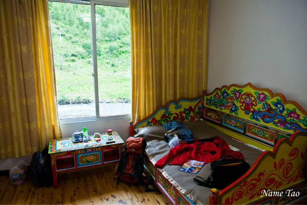 藏式大床观景房,窗外就是小桥、流水,还有这个特色的大床。。。这里的坏境还是很不错的,屋子很大,有电热毯,晚上不会觉得很冷,有24小时热水,但是建议洗澡一定要注意不要着凉感冒,在高原感冒了是可个麻烦事儿。