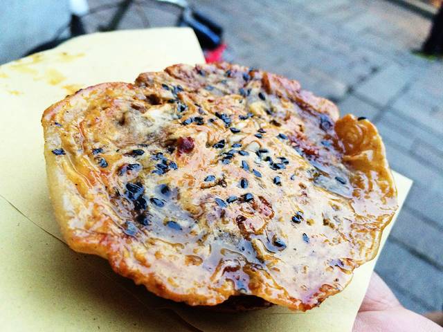 在这边一个画着央视美食报道的老人处买了桂花海棠糕,表皮酥脆,很烫,散发着花香,入口瓜子仁、芝麻,吃到里面还有糖枣泥作馅,每一口都是惊喜。这边有特色的甜粥,用鸡血米,20元一碗,太贵,没舍得买。