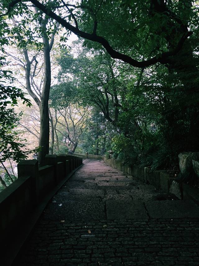 来海宁其实因为行程改变,多出来一天时间,正好高中挚友超在这边工作。所以在这稍作停留,换句话说,就是来见一面顺便蹭顿饭。从上海到海宁时也不过十点钟,心想先在附近看看美景。海宁火车站很小,门口有很多金黄色的银杏树,这里有在站口擦鞋的,过往有骑三轮载客的,我顺着百度地图前行,来到西山下。小桥流水,西山郁郁葱葱,我忍不住用自拍杆自拍,有老人上前,一口的海宁话:“你这是个什么东西呀”。顺着西山向上,满目青翠,石头上的苔藓都特别招人喜欢。隐匿于山上有一座庙,名字叫做“广福寺”,竟然跟青州那座庙重名。在青山绿水间,燃香的味道幽幽,如此美景,真可以用怡然这个词来形容了。
