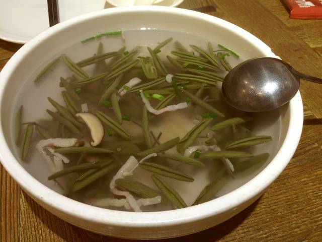 西湖莼菜汤,一上来看倒清汤寡水的立刻引来男友不满,承出来品尝,有一股淡淡的清香,莼菜口感滑嫩,有点像香菇但又有清香,简直是欲扬先抑了一把