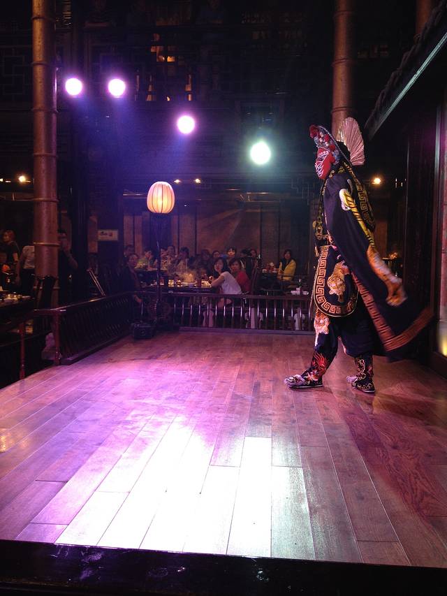 又转了两圈觉得实在无聊,干脆进饭馆里面等。这时才知道为啥服务员说至少要7:40之后才可能有位。一进屋,就听到锣鼓点响得紧凑。过了影壁墙,好家伙的,楼上楼下、包间里、散座上,大家纷纷抢到有利位置看影壁墙后舞台上的武旦表演。