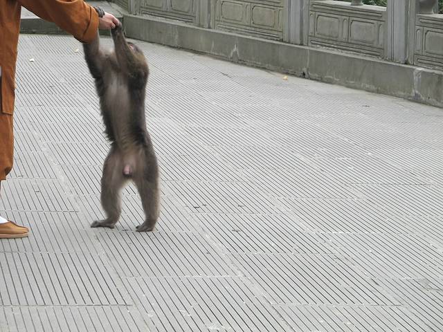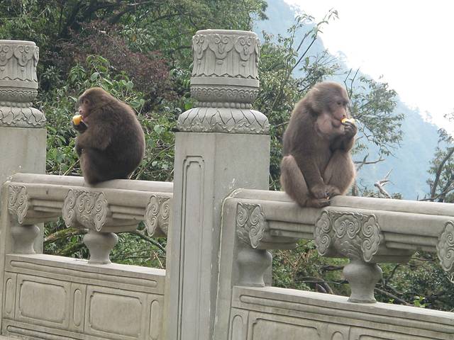 我们夫妻俩是严重赞同人与大自然和谐相处的。可从种种渠道的媒体看来,景区的猴子们似乎名不是很和谐啊。为防止山上寒冷,我们俩穿的是长袖服装,倒是可以为猴子抓咬做一些防备。可他们要是拉开我们的书包,把里面的东西丢得满山都是,也是要了我们的亲命啊。