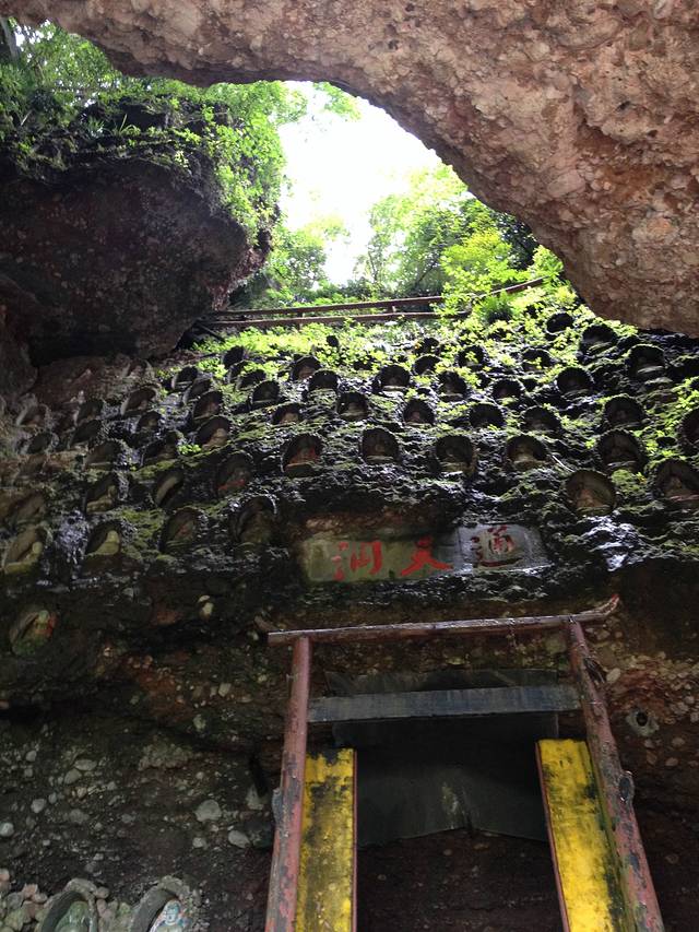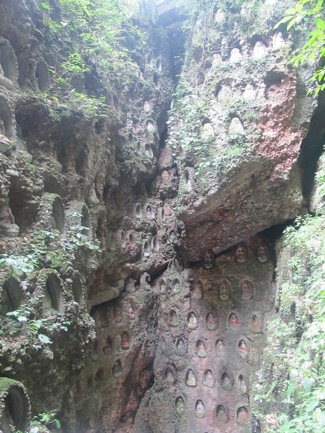 不过这辛苦还是值得的在靠近顶端的部分有那么几处景点,我佛洞和地藏洞固然难得,山顶的白云寺才是鬼斧神工,令人惊叹的所在。它的大殿暂且不提,因为到了地图上所标注的景点后,首先映入视野的是一个石窟,石壁上密密麻麻嵌满了一尊尊小佛。