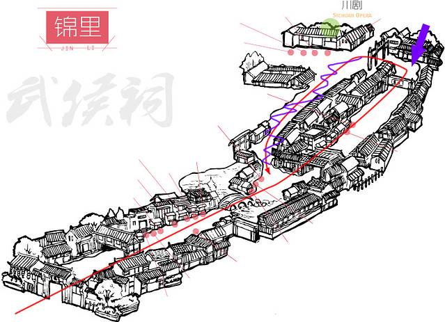 锦里不完全街景,找不到地图就在网上找了一张。大家见谅。红线为我们转的第一圈路径。紫色箭头为给我们极糟印象的第一家店,紫色波浪线的部分便是被我们视为天堂的小吃街了