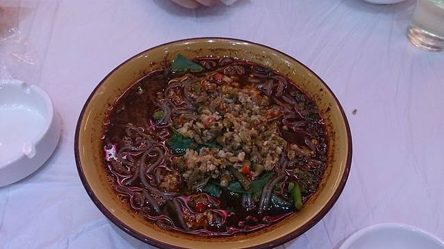 成都到青城山有很多动车班次,我们买的12:51出发的D1103。还有2小时发车,而我们初次来成都。不敢去远处找好吃的馆子。所以在车站附近找了一家“陈麻婆豆腐”的老字号店。但对比我们后来在成都市内吃的“陈麻婆豆腐”,现在想来,这家店可能也不老是正牌儿的。也可能是我们点的不对。一份豆花面,一份酸辣粉,多少让我们有些失望……
