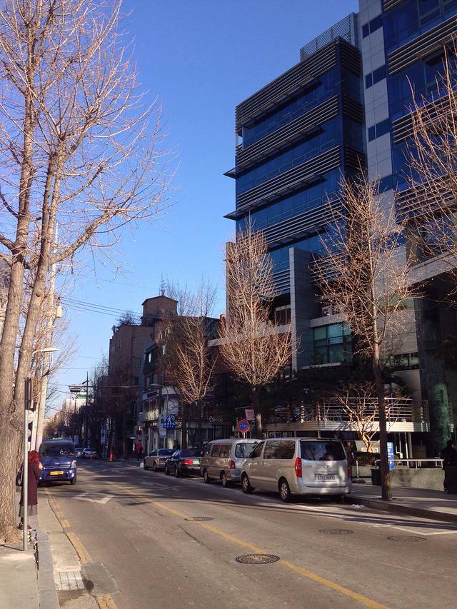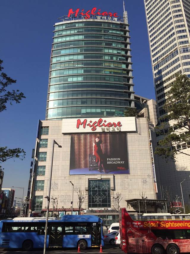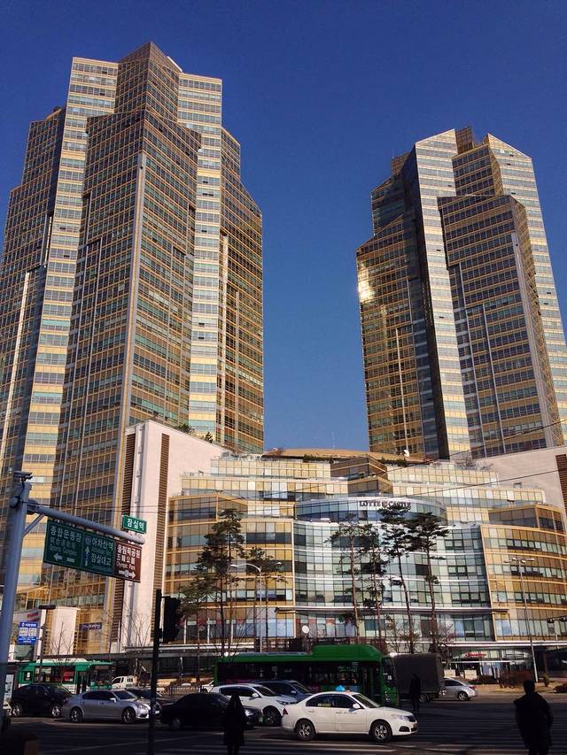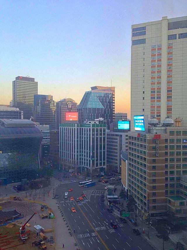 清晨的首尔,乙支路。右手边米色建筑后面就是乐天酒店、乐天百货、免税店、精品馆!