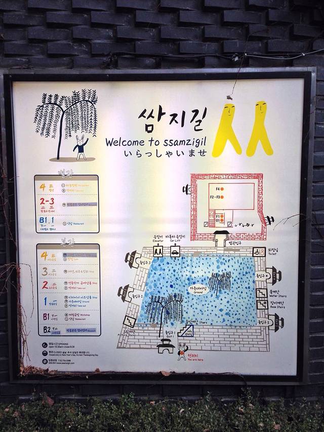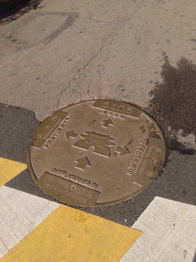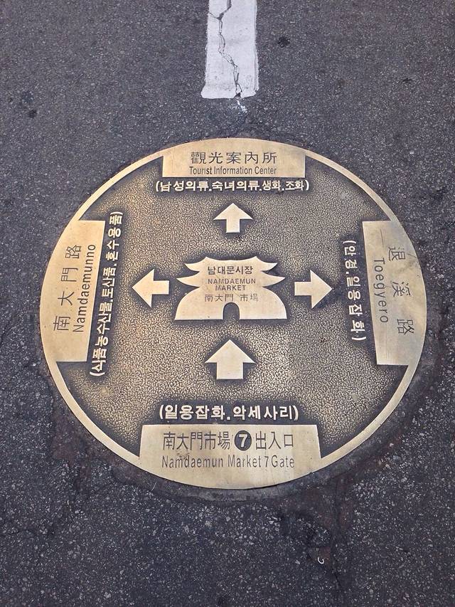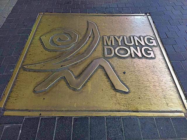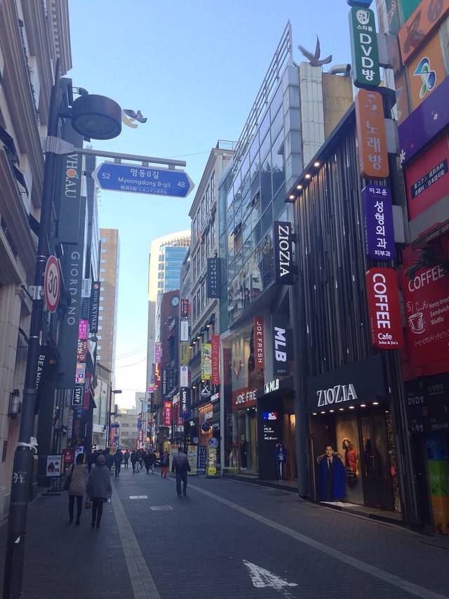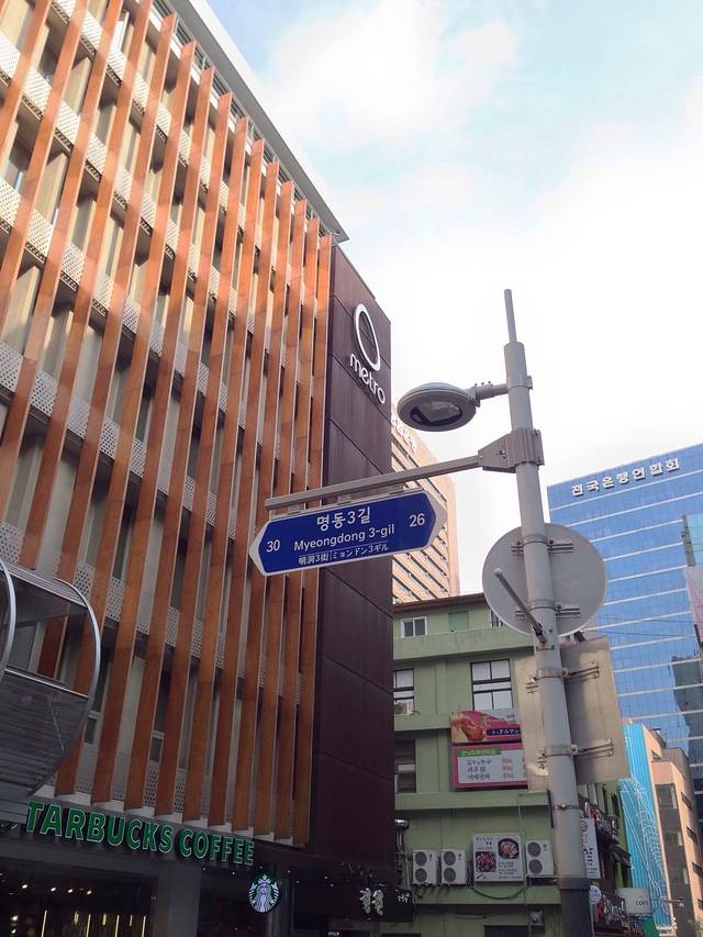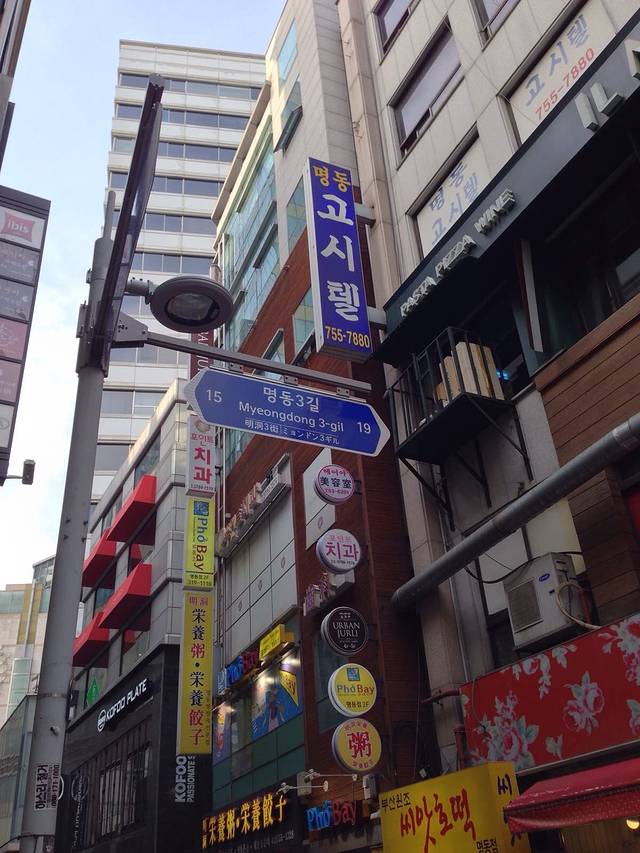 明洞的路牌有些乱,南北向的纵路被明洞街分开,然后路名就不一样啦!而横街则以纵街路牌号的副路牌号标示。