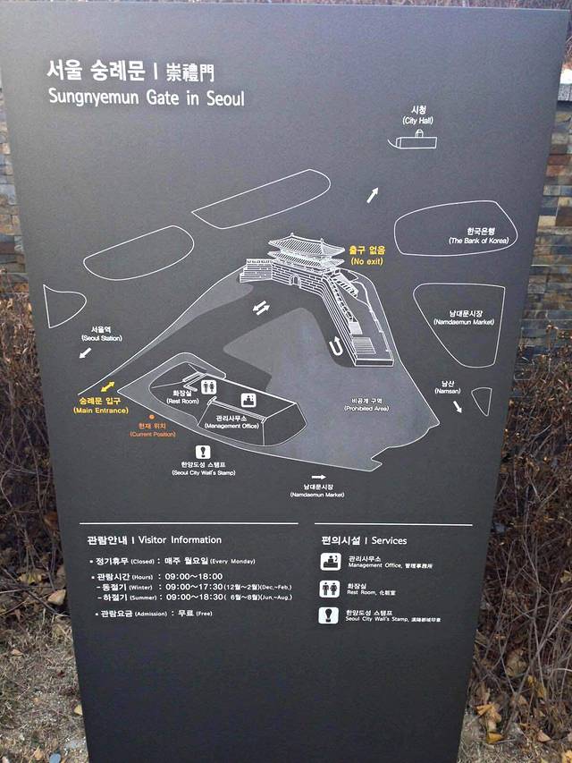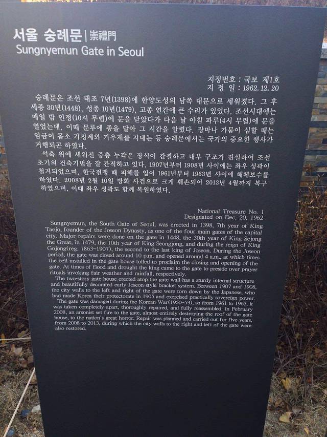 崇礼门(又名:南大门)建于明朝1398年,位于首尔市中区,被誉为韩国的“国门“。1962年12月20日被定为韩国的一号国宝。