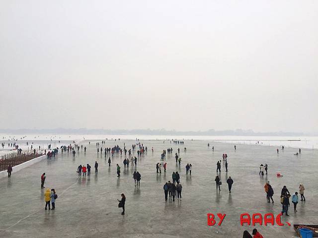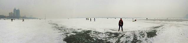 松花江冰盖上的一张全景图,误入'doubi'一只。