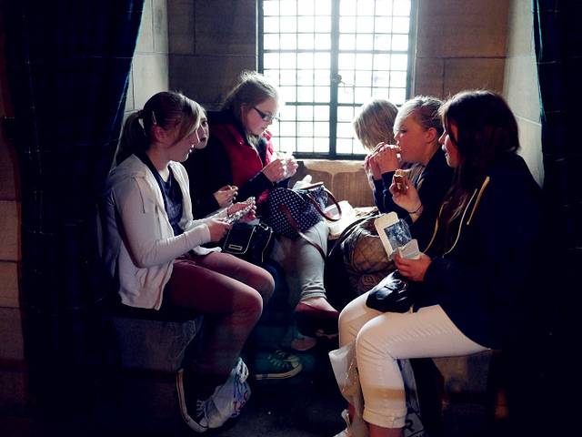 城堡有很多室内展示区,现在都成了游客的避雨地。