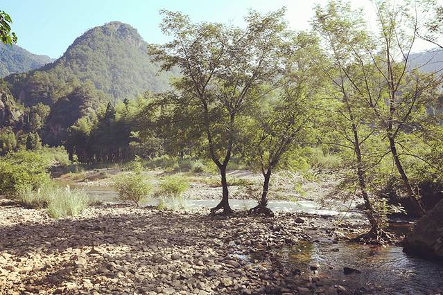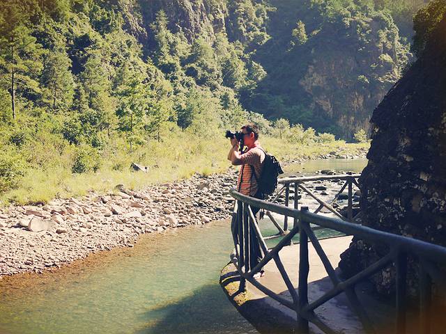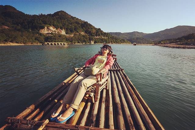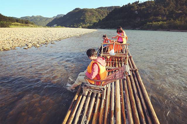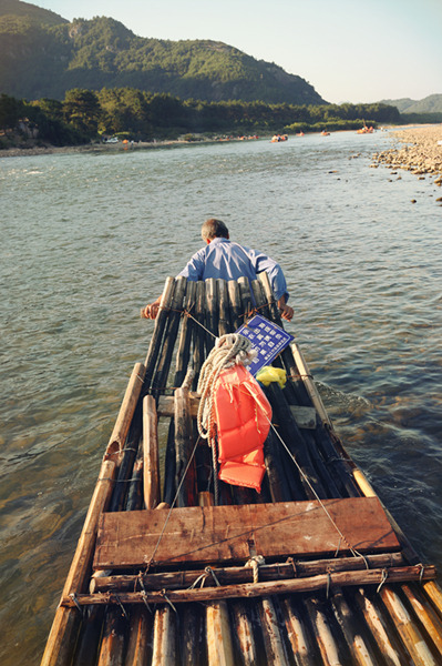 游江,竹筏漂流是不可省略的。顺水轻点蒿子,轻箭出弦,逆水则要肩扛步行,老翁虽矫健,却也心有不忍。
