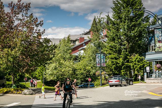 在惠斯勒游客可以沿着步道去探寻当地的商店、餐厅、咖啡馆和画廊,亦可以搭乘惠斯勒黑梳山的缆车鸟瞰中心城区的美景,还可以像这位老兄一样携带心爱的宠物同游惠斯勒,共享欢乐好时光。