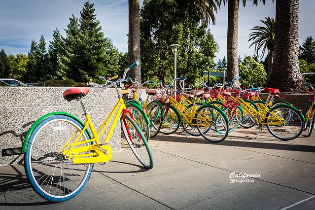 进入21世纪以后,我们的耳边听到最多的声音总离不开保护环境,绿色出行等词汇,我非常感叹的是,Google一直无声地将这些绿色出行的措施落实到实处,在谷歌公司的园区内,到处可见这些不带锁的自行车,免费提供给员工和游客代步。
