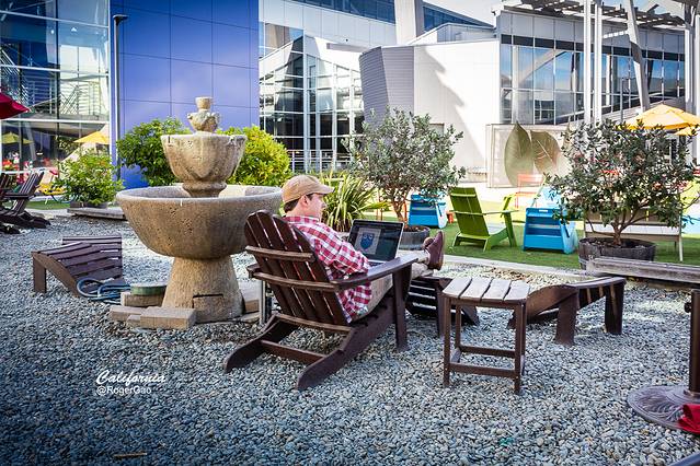 早有听闻谷歌公司的企业文化是塑造多人性化的办公环境,提倡不拘一格的创意思维,没想到眼前的这位帅哥还真的把他的工作地点设在这样一个开放休闲之地。