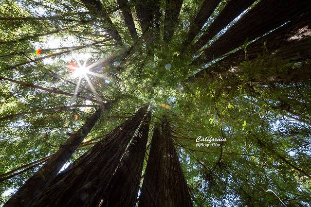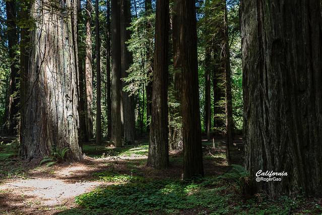 在树高林密的红木森林里,不同年龄的红木和种类众多的下层林群生长在一起,太平洋夹带着浓雾的海风常年不断地滋润着这片土地,为这些红木森林提供了一个得天独厚的生态环境。