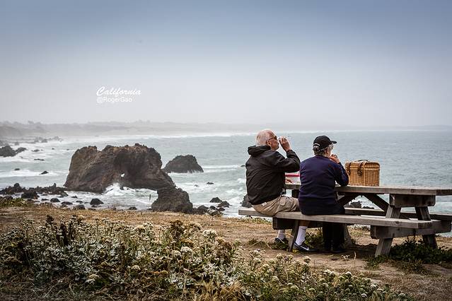 在风景这边独好的1号公路海岸的休息区,和老伴并肩享受着海风的沐浴,侧耳倾听拍岸的惊涛,品尝着竹篮子中的午餐,畅饮着杯中的美酒,此情此景让我第一时间想到了“最浪漫的事”的歌词: