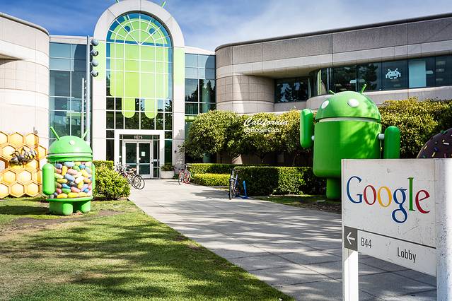 Google手机操作系统Android 安卓的图腾地位于44号楼前的草坪上,代表手机操作系统版本号的冰激凌三明治、姜饼、蜂巢、冰酸奶等甜点雕塑和绿色的安卓机器人分列在44号楼两旁。大楼的大门设计成手机形状,上面有安卓机器人形象。 “小绿人”面对甜点垂蜒三尺。
