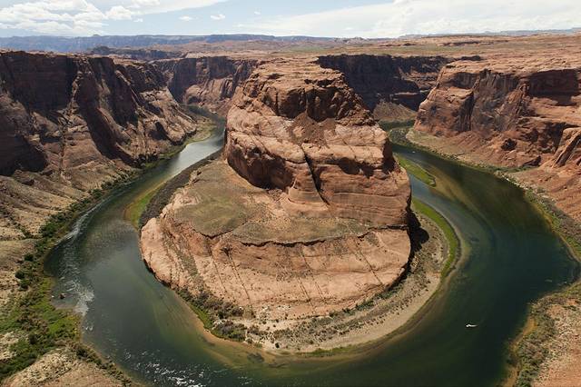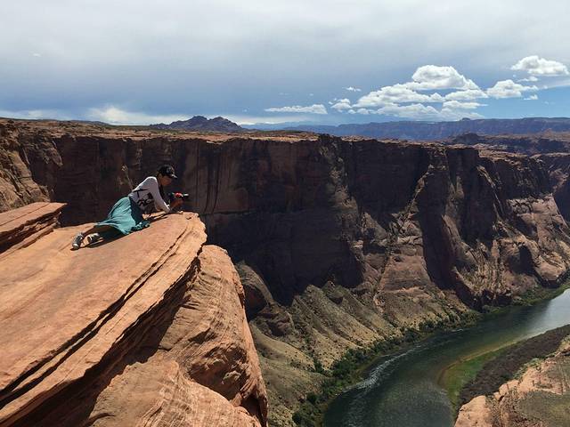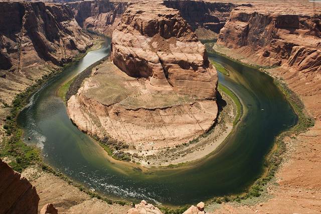 佩奇周边另一个有名的景点是马蹄湾(Horseshoe bend),从US89路边步行一小段路就可到达。科罗拉多河在此完成一个270度马蹄形回旋,水流速度变缓,长满了水藻,“红河”在这里变成了绿色。绿色的河水与褐色的岩石形成强烈的反差,视觉冲击力极强。更重要的是,比起价格高昂的羚羊谷,它是免费的!