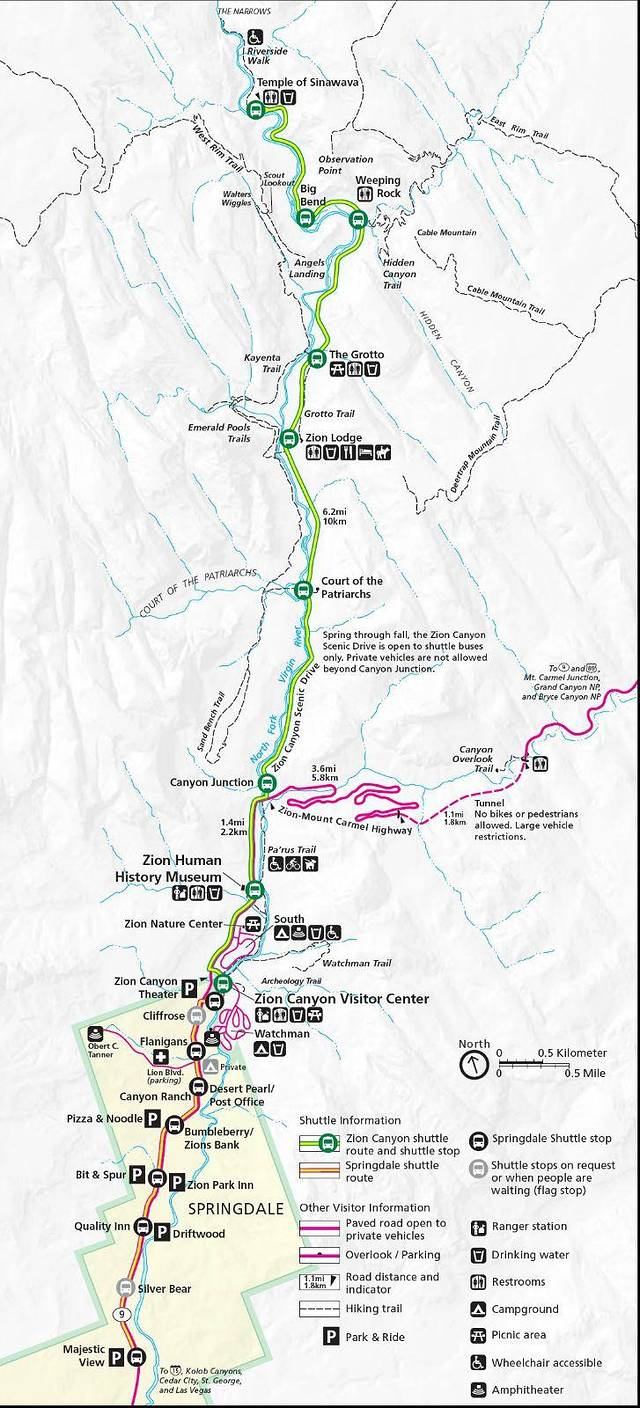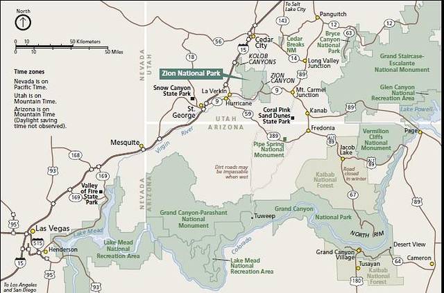 从拉斯维加斯过来的话,走I-15,出口16,然后接UT-9号公路,根据路牌提示,可以从南门入口进入Zion国家公园,这个入口相对最方便,买完票之后第一个路口右转就是游客中心,电影院,巴士总站,停车场,野营营地等服务设施综合站。