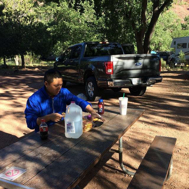 离开游客中心继续往前,就是格兰峡谷国家度假区Wahweap区域的南入口了,往北继续开5英里还有个北入口,当然南入口离Page最近,而且一路过去还能拍到不少好照片。门票10刀,国家公园年票通用。收费进去后只有一条路,沿着这条路一路开会有好几个观景点可以停下来拍照,也可以在户外座椅上用餐或者休息,闲暇时看看远程的山岩和近处的游艇,时不时的会有湖风拂面,清爽宜人。