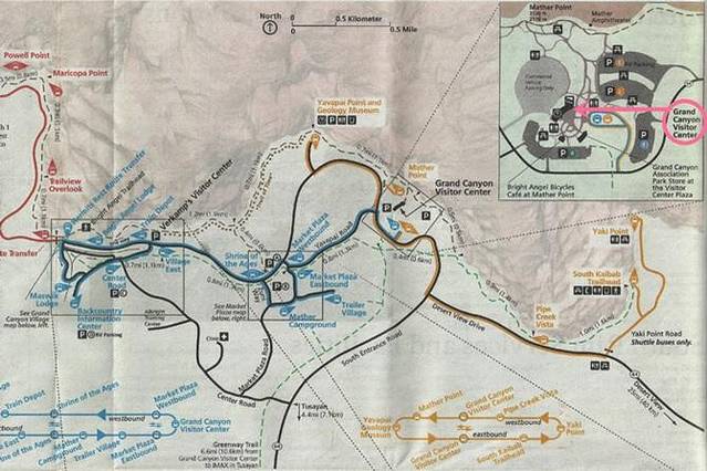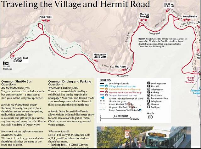 峡谷内有四条巴士环形线提供给游客搭乘。第一条为Village Route (蓝线巴士),第二条为Hermits Rest Route(红线巴士),第三条为Kaibab Trail Route (橙线巴士),第四条为Tusayan Route(紫线巴士),其中Hermits Rest Route红线巴士是三条线路中最长的,从Hermits Rest至Village Route Transfer ,也是最多人选择的一条路线。
