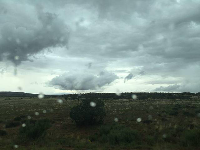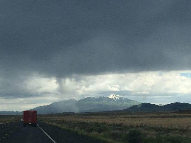 本以为今天是好天气,这在马蹄湾又是晒个半死的,结果离开page没多久天气又开始了间歇性暴雨的节奏。路上居然还有雪山,要说美国的自然景观的我个人觉得的最大的一个缺陷,就是没有真正的高原和雪山,没办法东西海岸太相通了,这和我们第三极那边的任何一座雪山都是没得比的:)