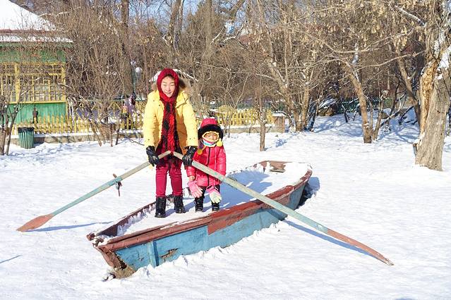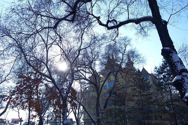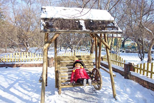 松花江虽然好玩,但站在冰上可不是开玩笑的,好冷,所以呆不久我们就要转战太阳岛了。太阳岛是在松花江上的一个大岛,面积很大,上面的景点众多,比较知名的有俄罗斯小镇、太阳岛公园和冰雪大世界等。我们就先到俄罗斯小镇看看。