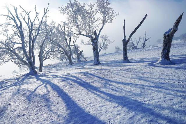 山上的树全都被积雪染成了银白色,就象是用冰做成的一样,绝美的景色