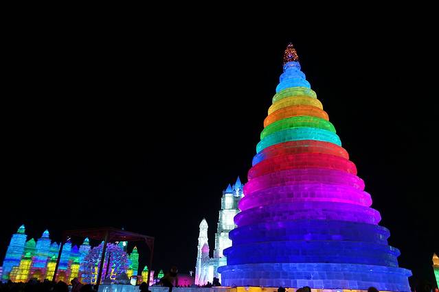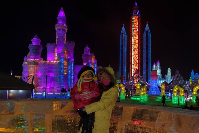 其实白天的冰雪大世界只能算是不错,真正漂亮的是夜幕降临以后。随着天色渐黑,冰雕里的彩灯开始绽放,整个冰雪大世界立刻变成了五彩缤纷。各种各样的色彩,就算是同一座冰雕,颜色也是不停的变换。